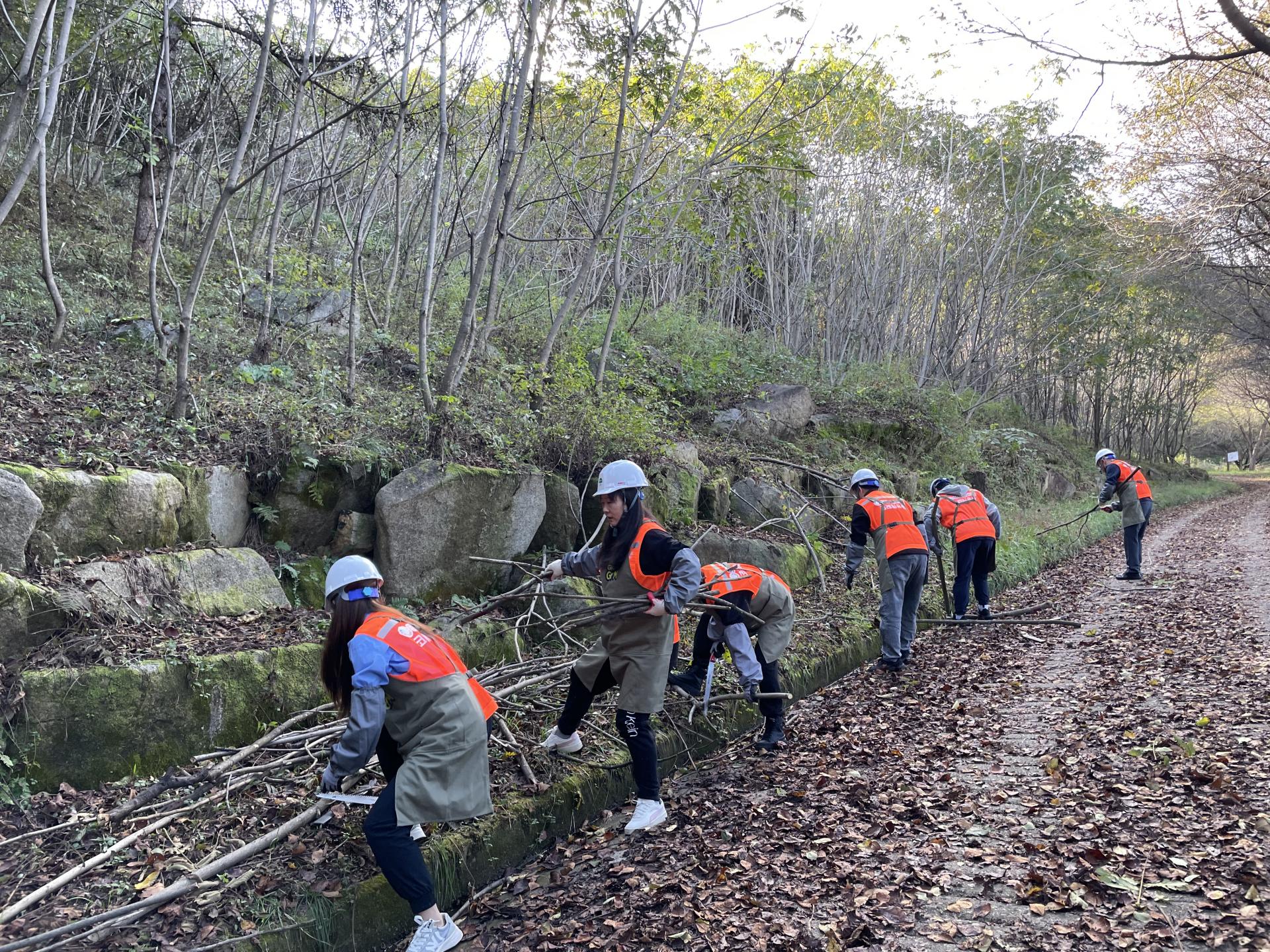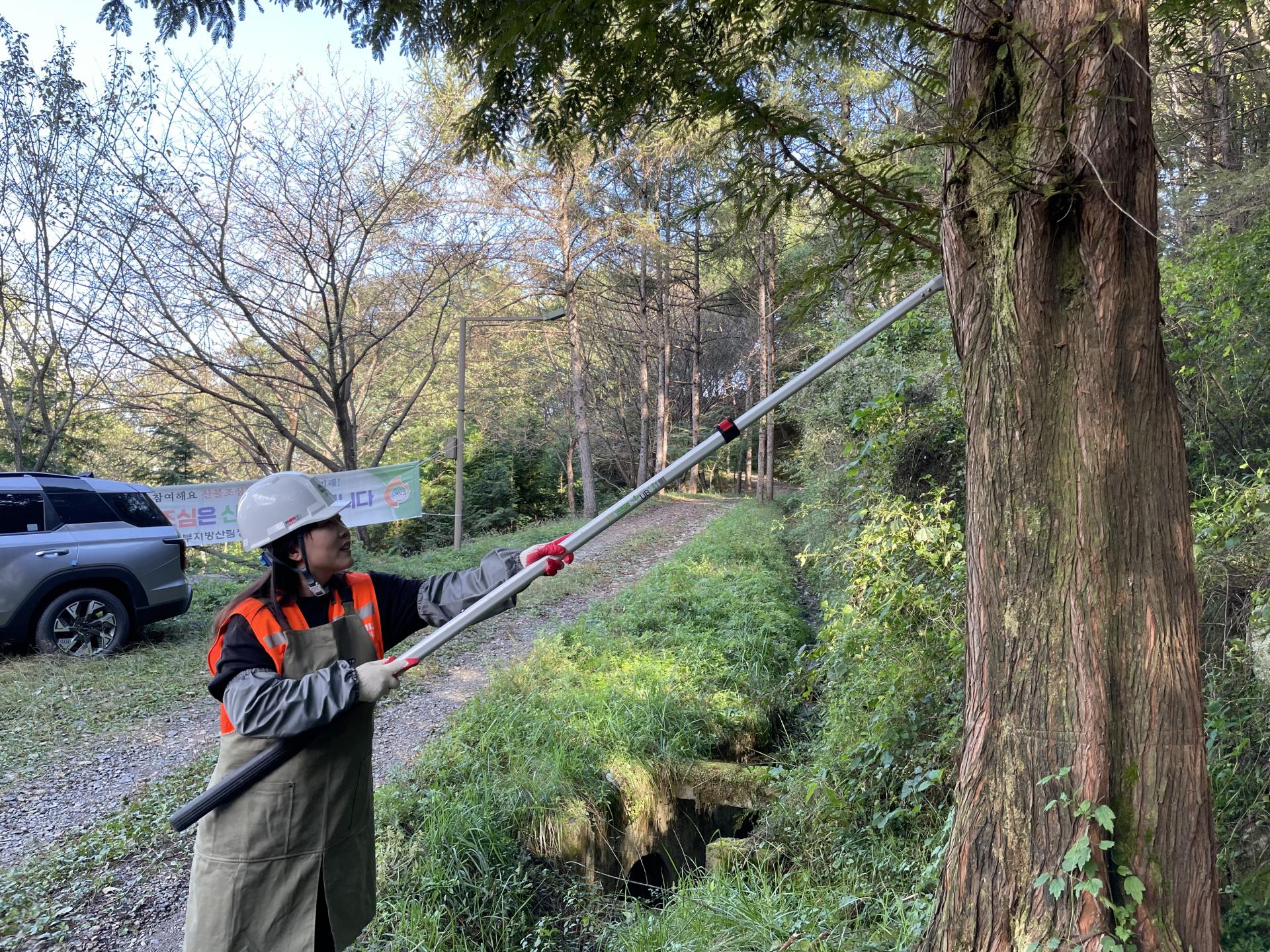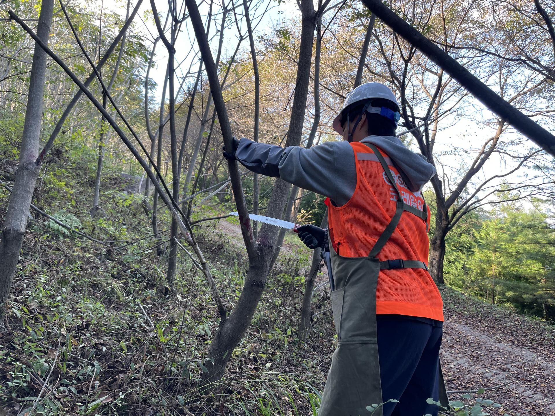 간단하게 몸을 풀고 고지톱을 이용해 메타세콰이어의 높은 가지를 자르는 시범과 함께 체험도 해봤고요, 본격적으로 공존숲 가래나무 조성구역에서 손톱으로 가지치기 활동을 했습니다. 자른 가지는 임도 옆에 가지런히 정리해서 모아두고 마무했습니다.